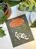 dimensions are 8in x 10in / 20cm x 25cm. printed on mid-weight watercolor paper. signed and numbered. edition of 10. space helmet not included.